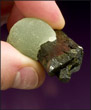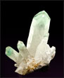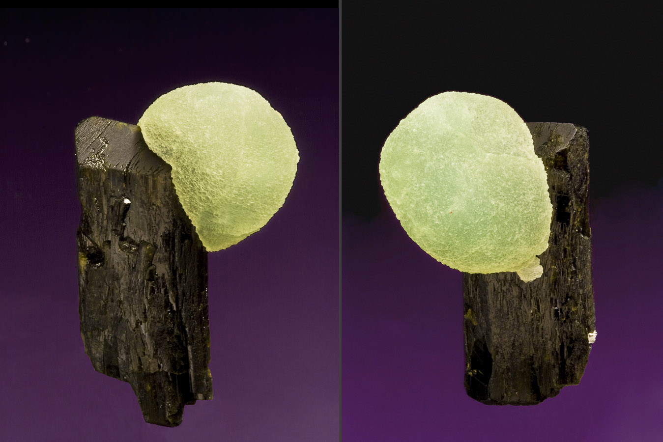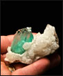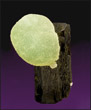 MMP-2002 - This competition level miniature features a translucent, lime-green prehnite ball perched attractively on a sharp, doubly-terminated epidote crystal. The piece is complete and undamaged with unusually nice terminations.