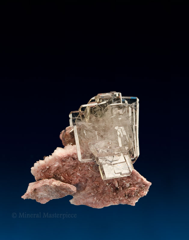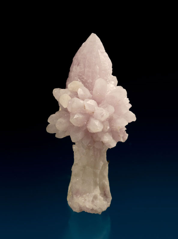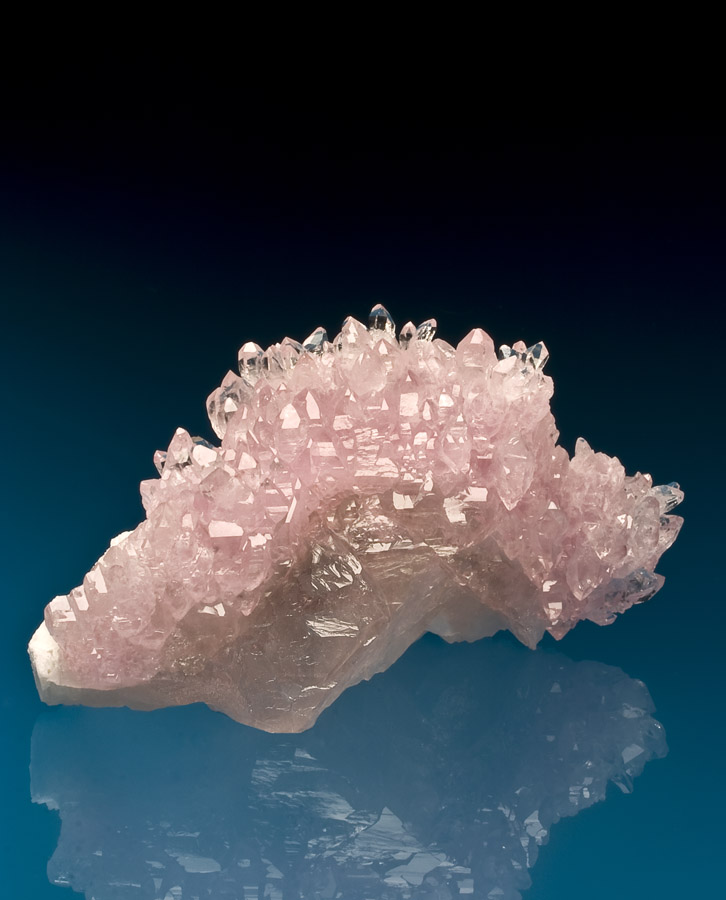 MMT-706 - Crowned with a halo of pink, this quartz specimen features suberbly lustrous, doubly-terminated rose quartz crystals, including many that are totally transparent. The overall quality of this specimen is very fine, and it has a way of grabbing attention when on display. The matrix of the specimen consists of cleavelandite and muscovite along with the faintly smoky quartz core.