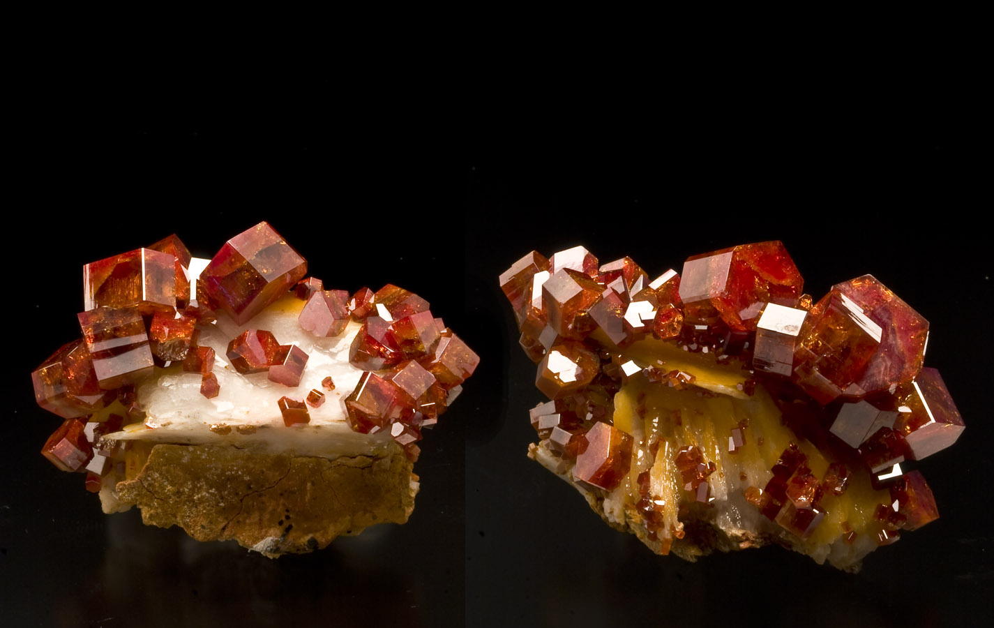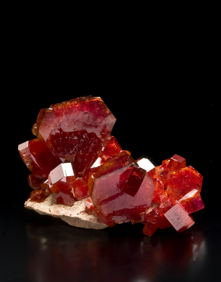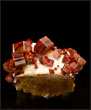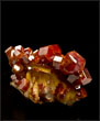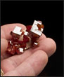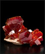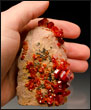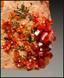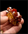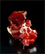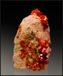 MMY-1225 - This attractive miniature features lustrous, red crystals with a hint of orange. The largest, (hoppered) crystal measures 1.7 cm. More three-dimensional than photos suggest.