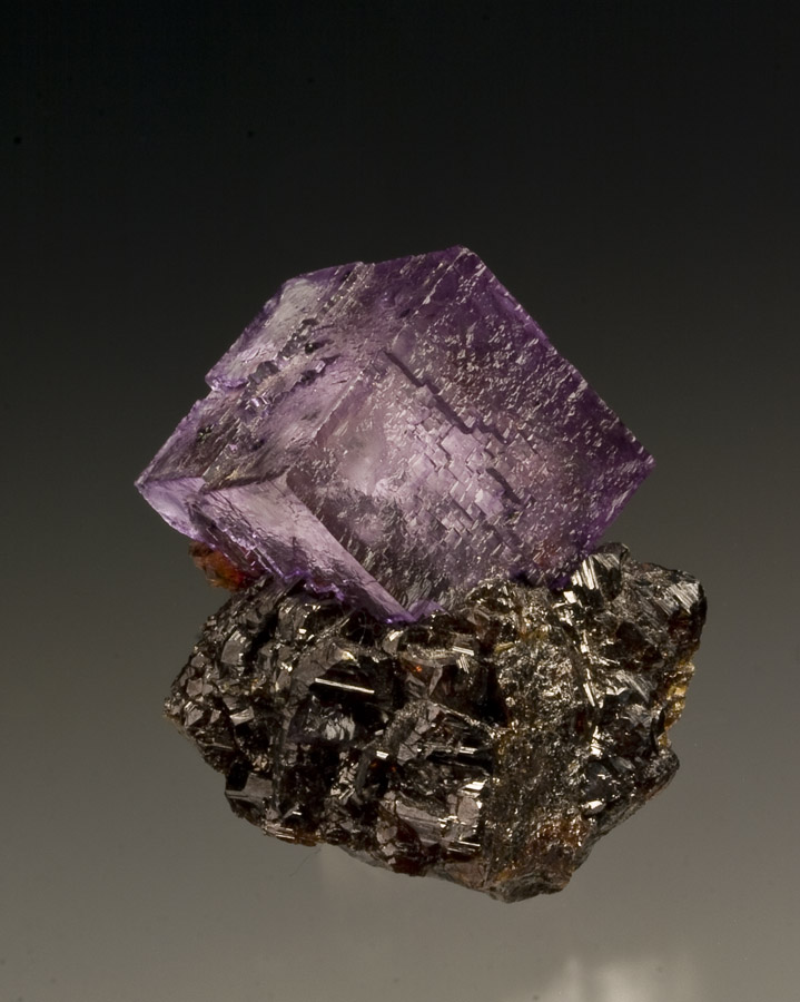 MMY-1244 - A sharp-edged, purple fluorite crystal with characteristic phantoms rests atop root-beer colored sphalerite in this classic combination piece from Elmwood. A very nice miniature with superb transparency.