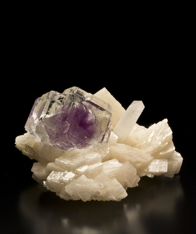 MMY-1275 - This attractive combination piece features a glassy, transparent fluorite crystal with a purple phantom at the center. The dolomite matrix is itself very well crystallized and quite lustrous. A quartz spire rises from the matrix next to the fluorite. From a find near the end of 2008.