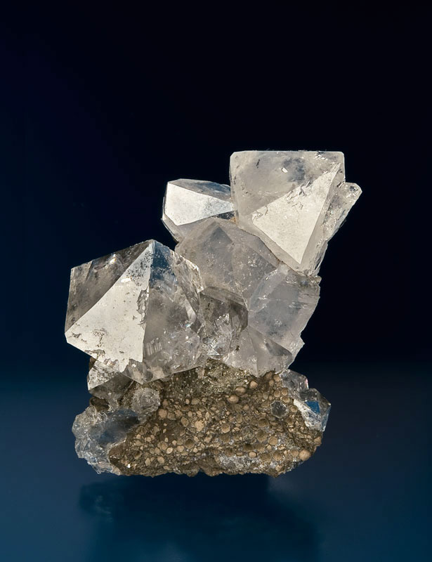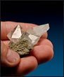 NY-111 - This beta quartz miniature from Dal'negorsk features a 2.1 cm main crystal that is quite transparent along with several additional crystals in the cluster all on a gray matrix. This nice specimen is better in person as the camera did not capture the transparency or the form of the crystals adequately.