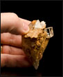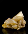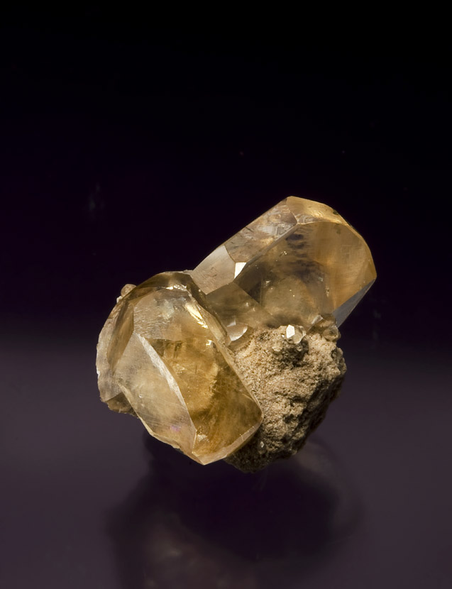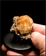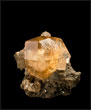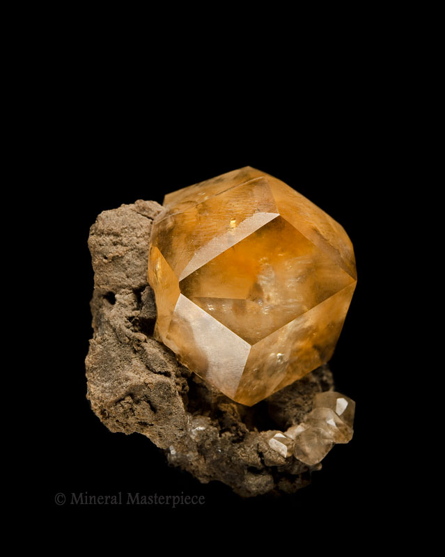 TYP-008 - A lustrous, golden-amber colored calcite twin sits on just the right amount of matrix in this very fine miniature specimen from North Vernon, Indiana. From one of the premier calcite localities in the U.S., this crystal measures 3.0 cm and shows good transparency. It is complete all around and displays well from all angles. Several smaller calcites on the lower right add a nice aesthetic balance.