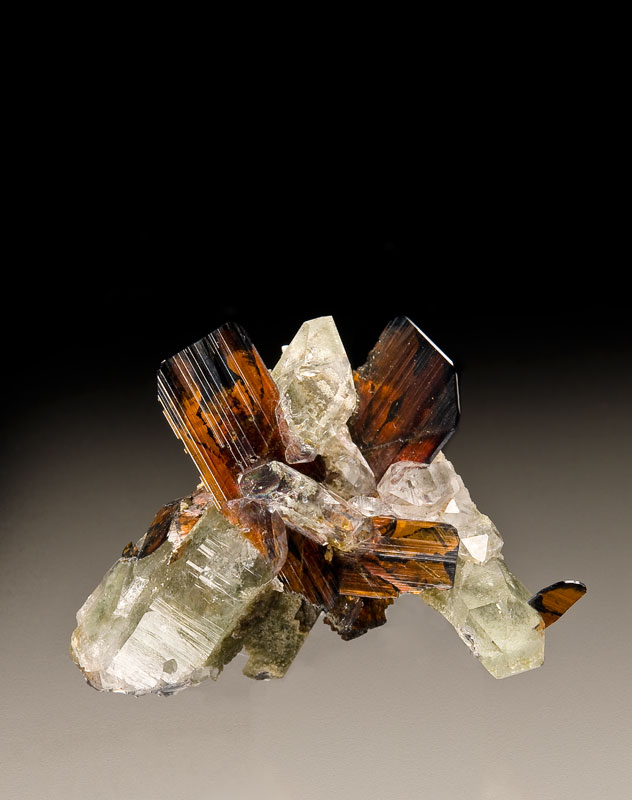 NY2-318 - Several beautiful deep reddish amber colored brookite crystals radiate from a cluster of quartz colored green by chlorite inclusions. In the middle of the specimen sits a doubly-terminated quartz. This piece has great economy of form...great horizons and arrangement with nothing missing. Very dramatic in person!