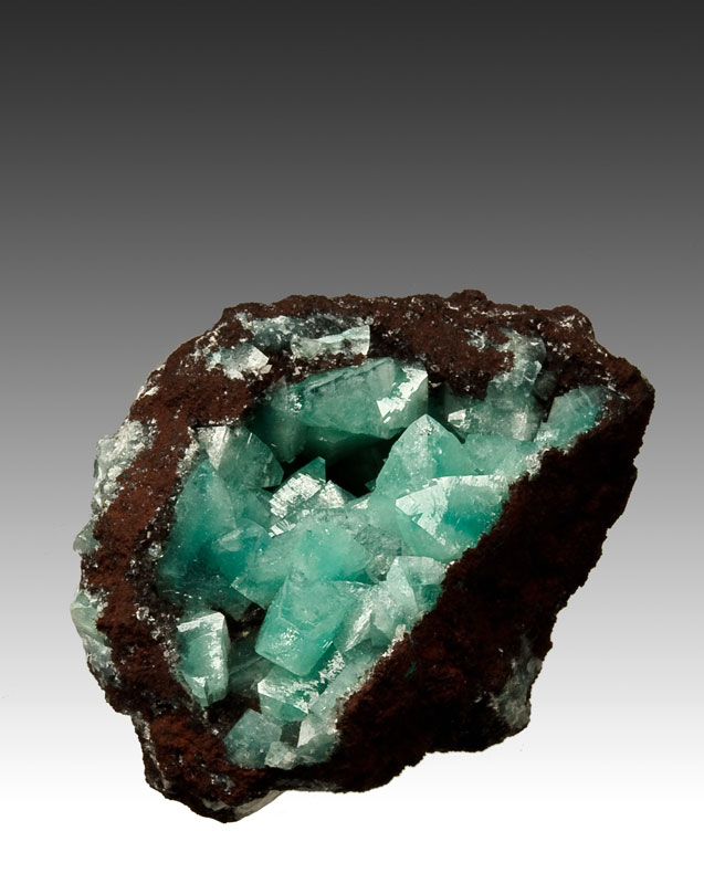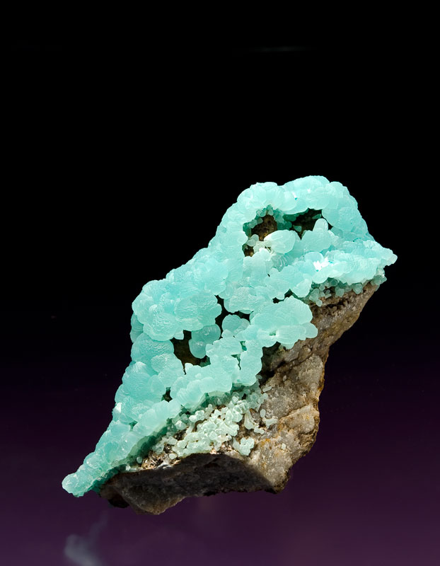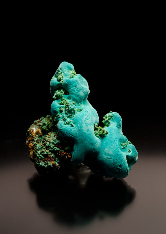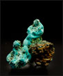 TYP-001 - This sculptural arrangment of velvety sky-blue rosasite is nicely accented by grass-green crystals of conichalcite. The three-dimensional nature of this piece, with its rolling folds of botryoidal rosasite that extends off the limonite matrix gives this specimen an extra appeal. May be displayed from all angles.