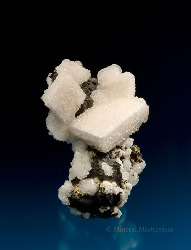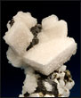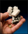 NY2-347 - This lovely Naica miniature features several glistening white calcite rhombs on a contrasting crystallized sphalerite matrix. In person, this piece has that little extra "something," where every aspect of the piece is in the right place...a certain aesthetic that transcends price. There are scattered clusters of pyrite across the surface for a nice accent. The back is likewise covered by calcite.