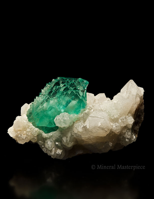 NY-143 - A sharp, sea-foam green adamite crystal colored by copper is lined by a white layer (rare style) in this attractive miniature from Ojuela. The main crystal measures 2.1 cm and is pristine. There are additional crystals tucked in a vug on the right of the specimen.