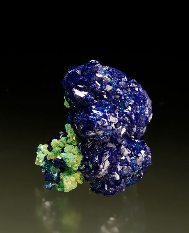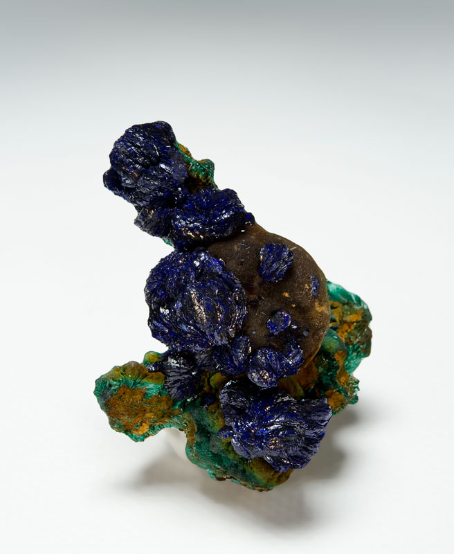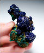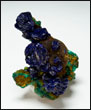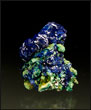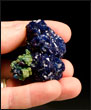 NY3-431 - With a vibrant, rich blue color and high luster, this malachite miniature from La Sal, Utah can hold its own next to fine azurites from around the world. The specimen is a floater, complete all around, and the light green malachite adds a good measure of color on both the front side and the back.