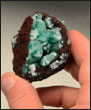 MMY-1226 - Superb orange-red crystals with glassy luster perch on a contrasting matrix of barite in this very attractive miniature. The largest crystals measure more than a centimeter across with thicknesses of 0.7 cm. Displays well from all angles. This specimen would make a wonderful companion piece to the dioptase specimen above.
