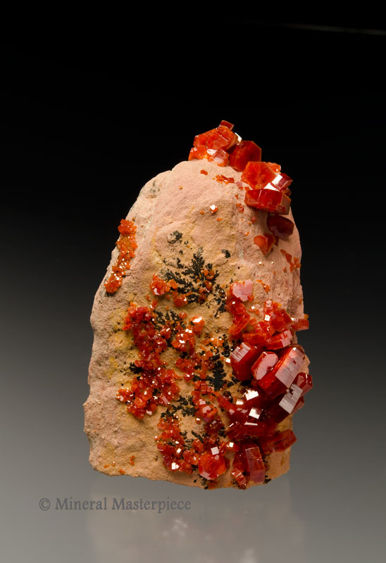 NY3-434 - Constrasting very nicely on a peach-pink sandstone matrix, clusters of vanadinite richly coat the surface of this specimen. Adding to the aesthetics, fern-like patterns of manganese oxide interconnect many of the orange-red vanadinite crystals. If you are looking for a unique vanadinite, this is it!