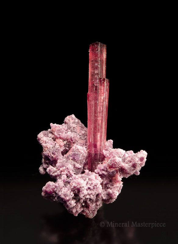 NY4-504 - This lovely, lustrous tourmaline specimen features a pink core followed by a mint green center and topped with a vibrant pink cap. Lavender lepidolite adds an accent, and the main crystal is complemented by a contrasting matrix of cookeite coating clevelandite. The termination is complete and wonderfully glassy with a tiny sidecar crystal. The main crystal (5.2 cm) is complete from all angles.