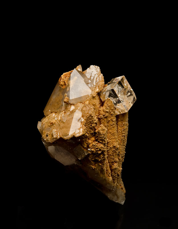 TYP-004 - A pair of completely transparent penetration twin fluorites nests between several quartz prisms that are evenly coated with siderite. Note that the entire specimen is a doubly-terminated quartz crystal floater that is both included by siderite and coated with it on the outside. The specimen is pristine, and the fluorites are much more gemmy than photos indicate. Wonderfully intricate and attractive!