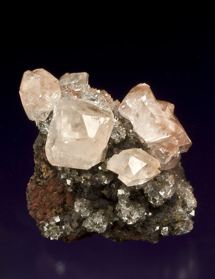 MMB-700 - Boasting great luster and complex crystallization, this fine quality calcite specimen has several isolated crystals (to 3.5cm) colored red with hematite inclusions. The larger crystals formed after an earlier growth of calcite rhombs, some colored by hematite, some clear, and some colored yellow by an unknown agent. Overall, the piece is all flash...very attractive and significantly better in person!