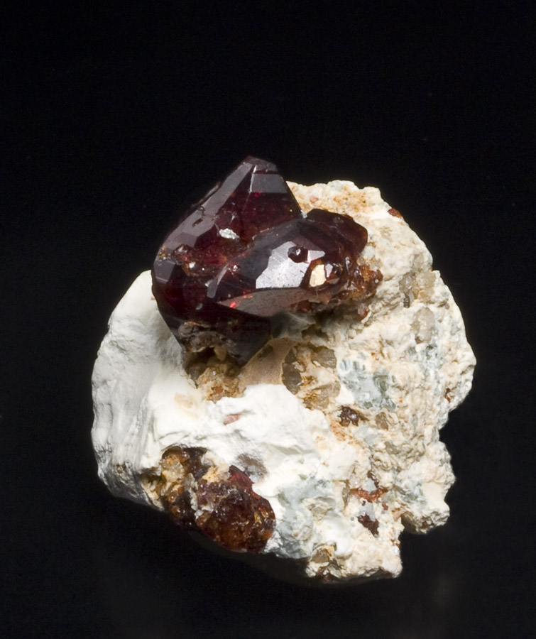 MMB-703 - A pair of deep red, partially gemmy clinohumite crystals rests on just the right amount of matrix in this fine small miniature specimen. One crystal is doubly-terminated (the other almost) and both are sharply crystallized.