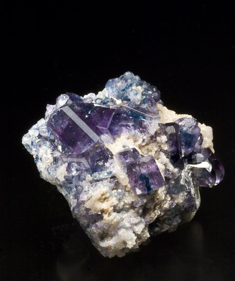 MMB-706 - Lustrous, purple apatite crystals with vibrant blue phantoms and complex terminations (most of the crystals are doubly-terminated!) are generously scattered across the matrix in this fine miniature specimen from Brazil. The specimen is a treat to hold in the hand and examine all the intricate details. This piece is substantially better than can be captured by the photographs.
