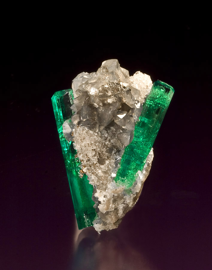 MMB-764 - Dueling for the eye's attention, a pair of quite gemmy, deep green emerald crystals (to 2.5 cm) nestles among smoky calcite crystals in this fabulous thumbnail. Both crystals are transparent enough that you are looking right through them in the photos shown here. Take our word for it, this is a world-class thumbnail that would strengthen any collection.