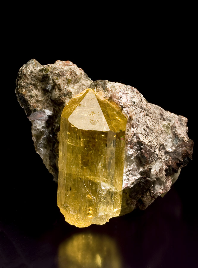 MMB-766 - A gorgeous lemon yellow apatite crystal measuring 4.5 cm rests on its host matrix in this fine small cabinet specimen from Mexico. The upper third of the crystal is particularly transparent, and the overall crystal is gemmier than the photos can indicate. Matrix specimens from Durango are few and far between.