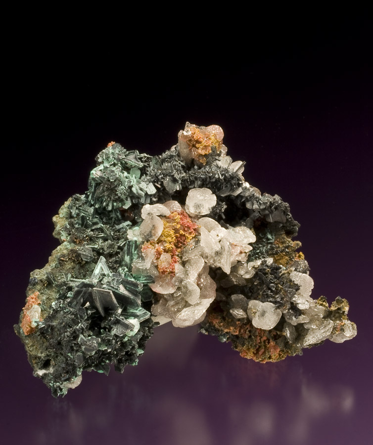 MMB-769 - Chalcocite crystals, many of which are twinned in multiple directions, cover this cabinet specimen from Australia. Providing an aesthetic accent are numerous calcite wafers arranged in a pleasing way around a orange and yellow mineralization (not yet analyzed...any guesses?).