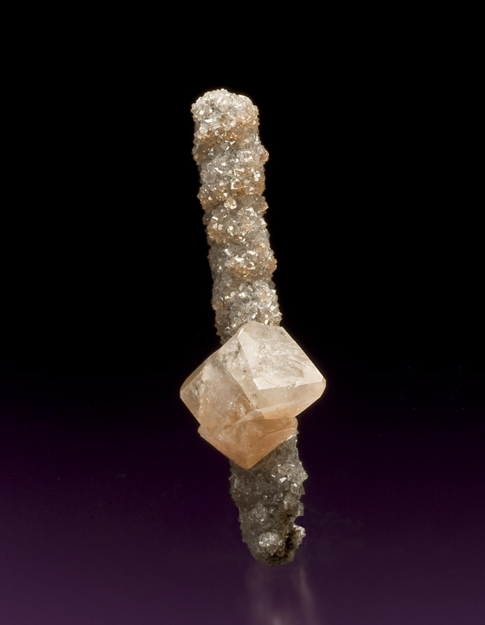 MMP-2001 - Natural sculpture! A lustrous, complex calcite crystal faintly colored by hematite inclusions clings to a stalactite richly covered by an earlier generation of calcite. The specimen is pristine from all angles. Specimens of this type were mined in the mid-90's and continue to dazzle to this day.
